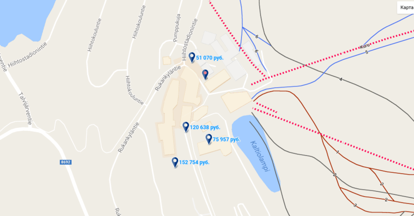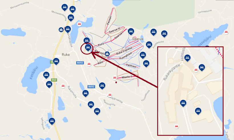 - Центр Рука (выделено в рамке на карте). Рестораны, бары, горнолыжные склоны и другие активности находятся в пешей доступности, чем и привлекают туристов. Если у вас нет машины, то этот вариант наиболее предпочтителен. Но нужно учитывать, что цены здесь повыше, чем в окрестностях курорта.