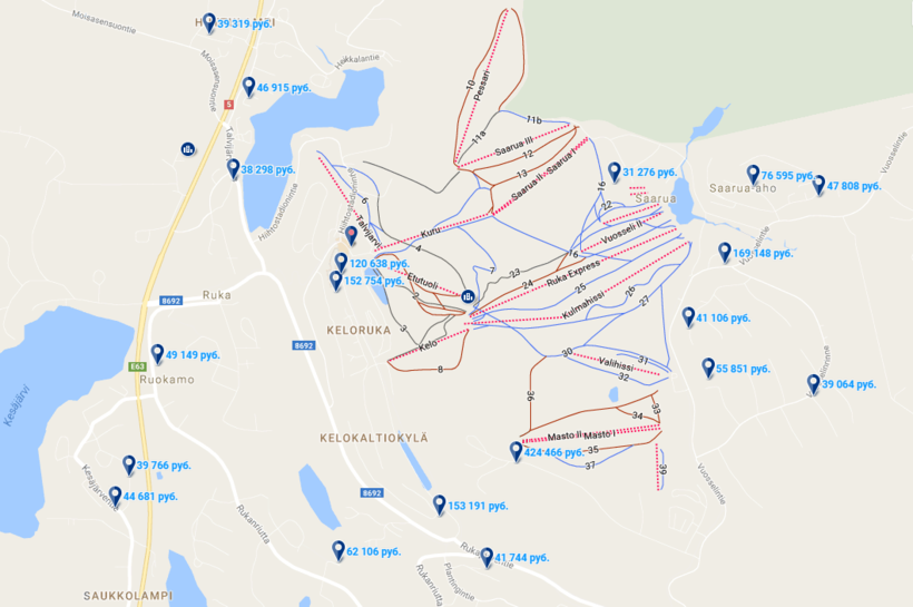 На курорте Рука всего 34 трассы. Карту можете посмотреть здесь.