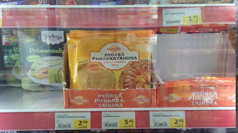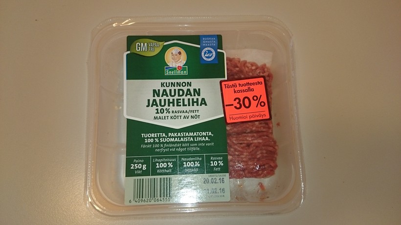 Однако в продуктовых магазинах Финляндии есть традиция снижать цену, если срок годности продукта подходит к концу. Таким образом можно купить филе лосося, грамм 400 за 5 евро с 30% скидкой (ищите оранжевые ценники как на картинке). Та же система распространяется на другие товары.