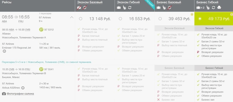Есть немало вариантов транзитных перелетов в столицу Киргизии, прямое авиасообщение между городами отсутствует. Например, одна из самых крупных российских а/к S7 предлагает добраться до Бишкека за 9 часов. Пересадка будет в Новосибирске (аэропорт Толмачево). Ее продолжительность составит 5 часов. Багаж можете сразу зарегистрировать до места назначения в аэропорту столицы Хакасии. Теперь про стоимость билетов. За авиаперелет только туда отдадите 13100 рублей. Эта минимальная цена актуальна за неделю до вылета воздушного судна. Авиакомпания предлагает четыре тарифных плана — два бизнес и столько же экономкласса.