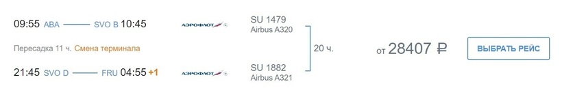 По маршруту Абакан — Москва — Бишкек летают еще самолеты «Аэрофлота». Самый оптимальный перелет имеет продолжительность 20 часов, это время включает и одиннадцатичасовую стыковку в Шереметьево. Билеты более чем в два раза дороже, чем у S7. Цены за перелет в одну сторону стартуют с 28400 рублей (за несколько недель). Если захотите совершить и обратное авиапутешествие с этой а/к, то купив билет сразу, сэкономите 25% от начальной стоимости проездных.