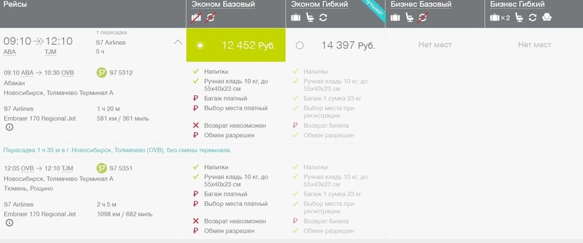 Авиарейсы выполняются на лайнерах Embraer RJ170. У этого самолета только одна компоновка без разделения. Кресла расставлены по схеме 2×2. Я много раз летала на Embraer RJ170 и скажу, что самолет не шумный и достаточно стабильный. Если вы высокого роста, то рекомендую забронировать место в первом ряду. Здесь есть дополнительное пространство для ног. Что касается тарифов, которые предлагает S7, то для этого маршрута есть только два тарифа экономкласса, которые различаются не только ценой, но и включенными опциями. Самый дешевый называется «Базовый». Он подойдет, если летите в Тюмень ненадолго и везете с собой минимум вещей. По условиям тарифа на борт можно взять бесплатно только ручную кладь. «Гибкий» является более продвинутым. Его опции:
