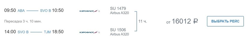 Также транзитные перелеты из Абакана в Тюмень выполняет и ведущая российская авиакомпания «Аэрофлот». Самолеты перевозчика летают через Москву (аэропорт Шереметьево). Минимальная продолжительность транзитного перелета — 11 часов. Получается в два раза дольше, чем у S7. На стыковку отводится 3 часа. Смена терминала не требуется. Цены на билеты у авиакомпании стабильные — билеты от 16000 рублей, что за неделю, что за несколько месяцев до отправления лайнера.