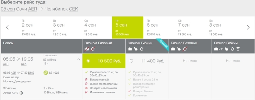 S7. Лететь также придется через Москву, продолжительность пересадки составляет около 7 часов, на авиапутешествие пойдет 12 часов. Это дольше, чем у Аэрофлота, однако выходит дешевле — билет в одну сторону только с ручной кладью обойдется от 10500 рублей. Я рекомендую взять тариф «Эконом Гибкий», куда включены багаж, выбор места, он дороже всего на 1000 рублей.