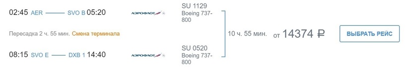 Так как прямые рейсы выполняются не ежедневно, то данный вариант востребован. Также можно рассматривать его как более дешевый способ попасть в Дубай. Сама летала транзитными рейсами несколько раз и расскажу про самые актуальные варианты. За 11 часов до места назначения можно долететь с «Аэрофлотом». На пересадку в столице РФ уйдет 3 часа, потребуется смена терминала в аэропорту Шереметьево. Удобно, что летите по единому авиабилету, регистрацию пройдете только один раз в аэропорту Сочи.