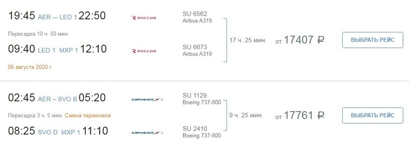 Вариантов перелетов много — более двадцати. Транзитные рейсы имеют разную продолжительность — от 8 часов до суток. Стоимость авиабилетов одинаковая — от 17700 рублей (за три месяца).
