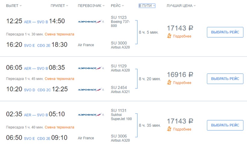 Летая из Сочи в столицу Франции, я выбираю транзитные рейсы, потому что ни один перевозчик не предлагает прямые перелеты. Есть вариант воспользоваться услугами следующих операторов: