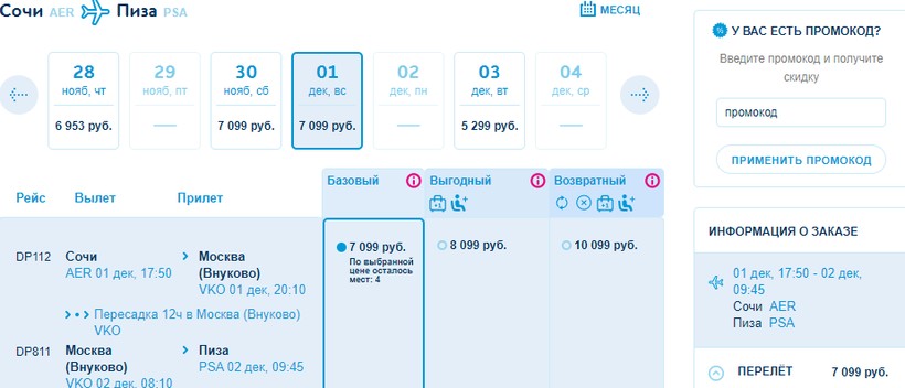 Можно неплохо сэкономить, если воспользоваться услугами лоукостеров. Сразу отмечу главный минус данного варианта — длительные стыковки (12 часов в Москве и почти 6 в Пизе), весь полет займет около суток. Кстати, пересадка в итальянском городе будет самостоятельная, нужно будет заново пройти регистрацию и досмотры. Расписание не смогу назвать удобным, нужные рейсы осуществляются лишь несколько раз в неделю. Вылет из Сочи вечерний.