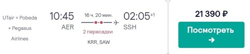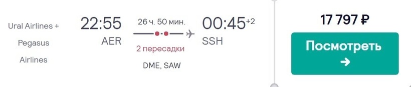 Также есть возможность купить билеты по более лояльной цене. Добраться до Шарм-эль-Шейха можно, заплатив 17800 рублей. Перевозчики: «Уральские авиалинии», Pegasus Airlines. Правда, дорога до места назначения будет долгой и займет немногим более суток, из которых 19 часов уйдет на стыковки в Москве и Стамбуле.