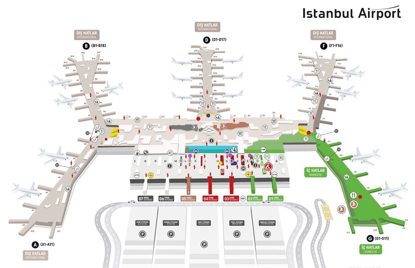 Аэропорт Стамбул пока имеет только один терминал: в его центре размещен огромный общий зал, который делится на международный и внутренний сектор. От общего зала отходят 5 пирсов — A, B, D, F и G. Пирсы A, B, D, F обслуживают международные рейсы, а G — внутренние. Кроме того, в международном секторе находится зона C (между пирсами B и D) с 4 гейтами и зона E (между пирсами D и F), включающая 4 гейта.