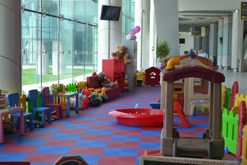 Для пассажиров с детьми дошкольного возраста на втором этаже аэровокзала есть комната матери и ребенка (правое крыло, рядом с лифтом). Хочу отметить, что посещать комнату можно только после осмотра в медпункте. Кроме того, на первом этаже терминала есть детская игровая зона.
