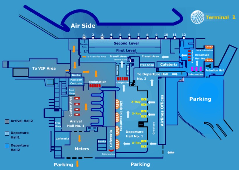 Терминал № 1 — состоит из 4 залов (зал № 1 — вылетающие рейсы, зал № 2 — международные, внутренние рейсы, зал № 3 — международные, зал № 4 — частная, бизнес-авиация).