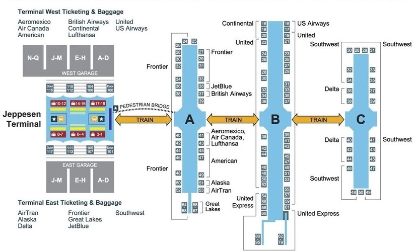 Один из крупнейших авиаузлов США состоит всего из одного терминала — Jeppesen Terminal. Здание шестиуровневое.