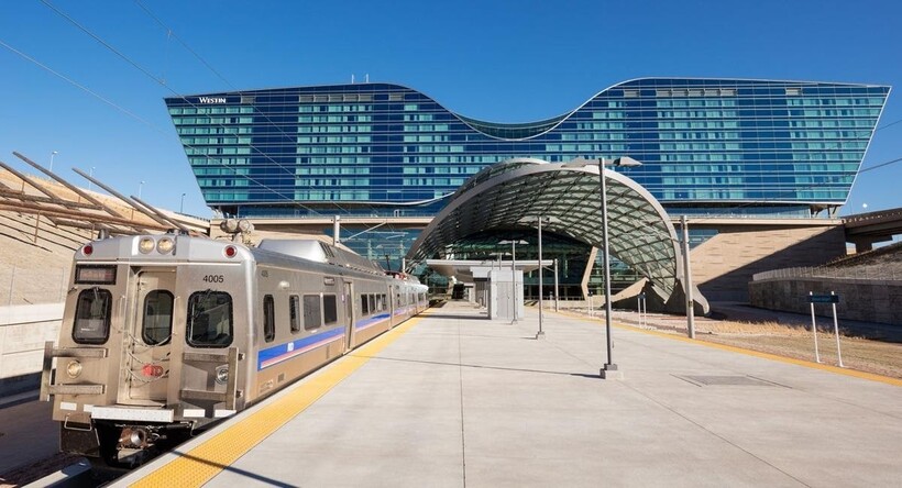 Аэровокзал удален от центра Денвера примерно на 40 км, доехать до города можно на поезде, автобусе или такси. Поезда из аэропорта до центрального ж/д вокзала Денвера (Union Station) курсируют с 04:10 до 02:00 примерно каждые 15–30 минут. Поездка занимает 37 минут, билет стоит 10,5 $ (770 рублей). Ж/д станция находится на 1-м уровне главного терминала (рядом с транзитным центром).