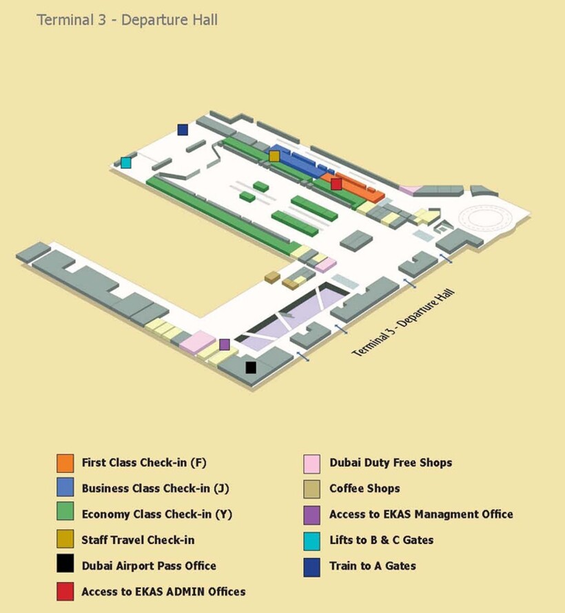 Терминал 3 принимает рейсы авиаперевозчика Emirates и его партнера Qantas. Кроме основного здания, используются конкорсы C, B (к ним ведет подземный переход) и A (добираться нужно на поезде).
