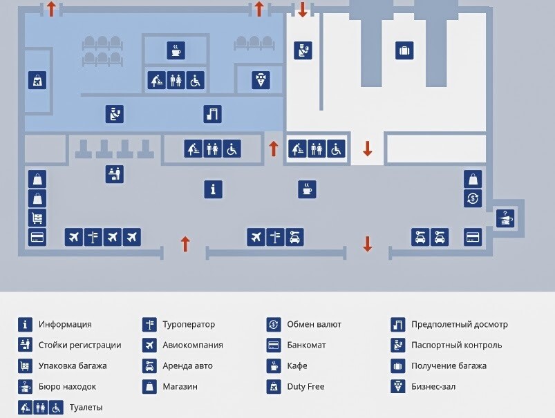 Пассажирам с детьми. Комнаты матери и ребенка в аэропорту нет, но есть отдельные туалеты с пеленальными столиками. Отмечу, что сдать в багаж детскую коляску можно прямо у трапа самолета.
