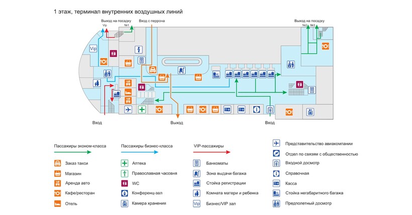 Зона регистрации на рейсы внутреннего сообщения находятся на первом этаже — прямо напротив центрального входа в терминал в противоположном конце зала. Зайдя в здание аэровокзала, нужно идти прямо, никуда не сворачивая. Регистрация начинается за 1,5–2 часа до вылета. Обращу внимание, что стойки регистрации в терминале международных авиалиний находятся на первом этаже. Чтобы их найти, нужно, зайдя в здание терминала, идти прямо до стойки вызова такси, далее свернуть налево. Стойки регистрации находятся за стойками таможенного контроля. Регистрация начинается за 2,5–3 часа до вылета.