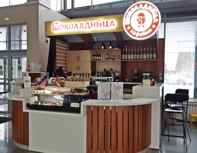 Еда. На первом этаже, рядом с выходом из терминала, находится кофейня «Шоколадница».