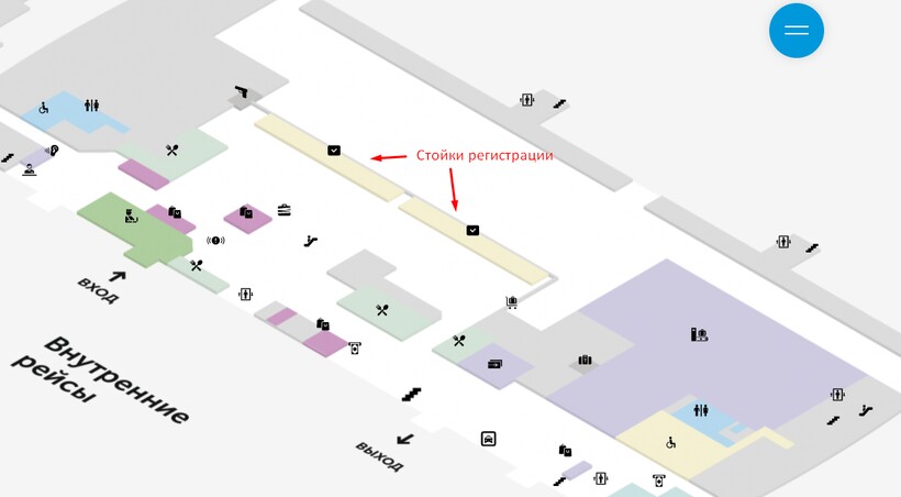 Прямо напротив входа, в центральной части терминала А, находятся стойки регистрации (25–51) на внутренние рейсы.