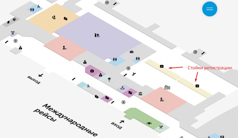 Зона регистрации в терминале В (для международных рейсов) расположена напротив входа, за пунктом таможенного контроля и службой Tax Free (стойки 1–24).