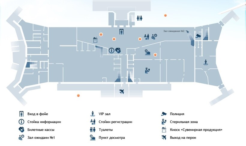 Стойки регистрации найдете в правой части терминала (1-й этаж), напротив зала ожидания. Собственная зона регистрации есть в VIP-зале, который также находится на первом этаже аэровокзала.