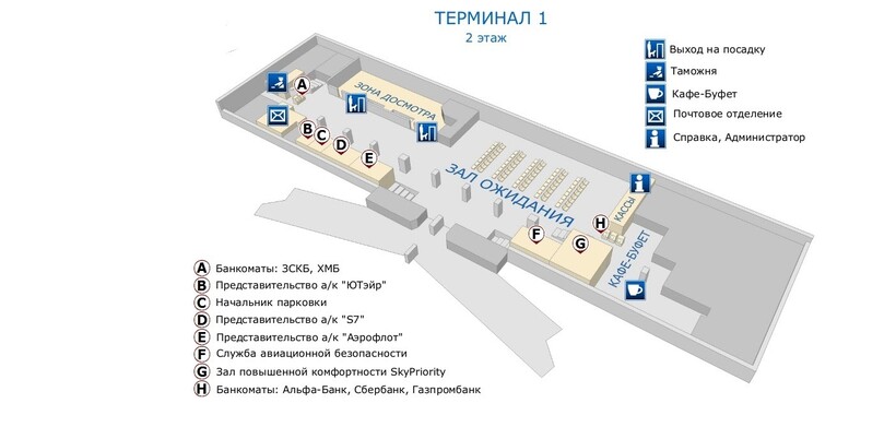 Также внутри терминалов аэропорта можно получить доступ к Wi-Fi (бесплатно). Почтовое отделение найдете на втором этаже терминала № 1.