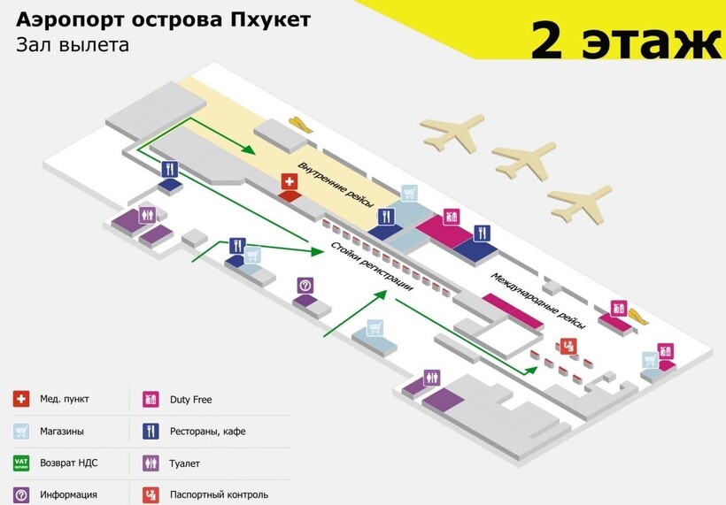 В аэропорту Пхукета магазины duty-free небольшие со стандартным набором товаров (алкоголь, сладости, сувениры, наборы орхидей). Расположены недалеко от зоны контроля и багажного конвейера в международном терминале. Пункт оформления такс-фри найдете в терминале № 1 на 3 этаже (около гейтов № 1 и № 2).