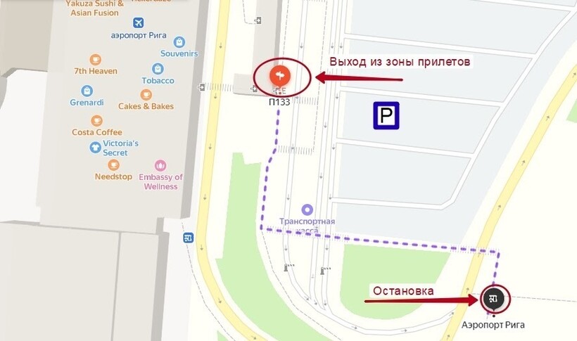 Билеты на общественный транспорт у водителя стоят 2 € (185 рублей), в киосках на автобусной остановке, а также в зоне прилетов в секторе E на стойке информации можно купить за 1,15 € (115 рублей). Поездка до города занимает около получаса. Такси до центра Риги доставит за 15 минут и 10–12 € (900–1100 рублей).