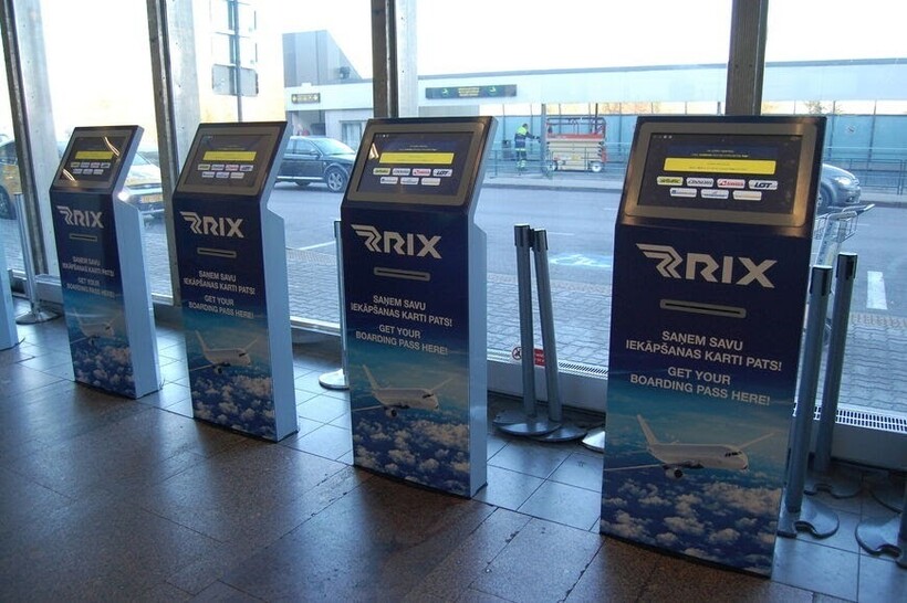 Отмечу, что рядом с традиционными стойками есть несколько киосков саморегистрации для пассажиров компаний airBaltic, LOT, Finnair, SAS и Lufthansa. Здесь же можно распечатать посадочные талоны, если вы зарегистрировались онлайн. Но сдавать багаж (при его наличии) придется все равно на общих стойках, так как Drop-off в рижском авиаузле нет.