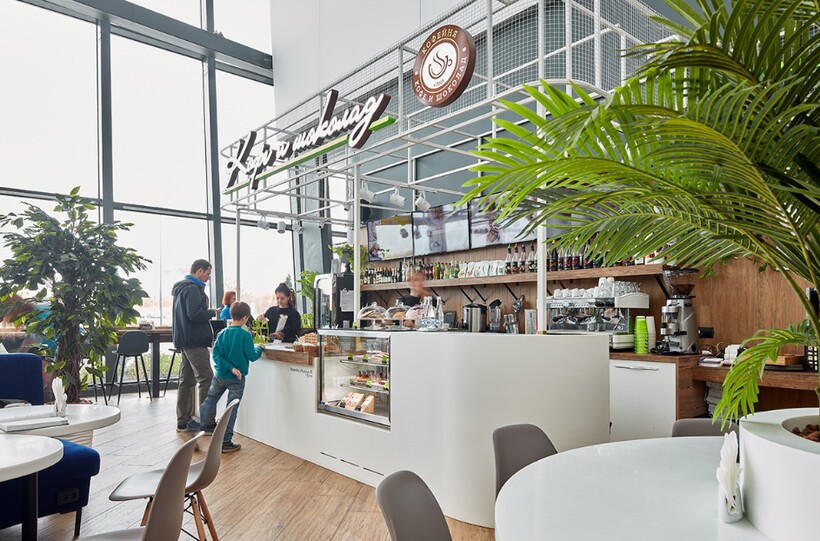Еда. На первом этаже в общественной зоне внутренних вылетов находится кафе «Кофе и Шоколад». На втором этаже ресторан быстрого питания, в ресторане есть возможность заказать еду с собой. В аэропорту есть автоматы по продаже кофе, прохладительных напитков и шоколадной продукции.