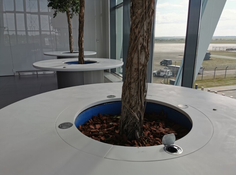 розетки (220В и USB) спрятаны в лотках с деревьями под металлическими крышками в зале ожидания на втором этаже;