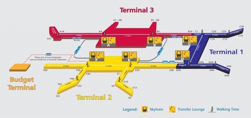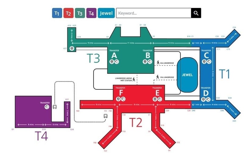 Три главных терминала смежные, добраться можно пешком по коридору, через комплекс Jewel Changi. Между терминалами № 1, № 2, № 3 курсирует монорельс Skytrain (с 06:00 до 00:00). Время в пути — 4 минуты. Из терминала № 4 отправляется автобус (раз в 20 минут) к терминалу № 3.