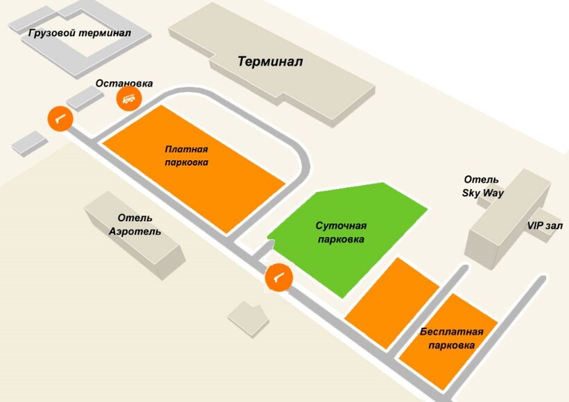 Автобусная остановка находится в 200 метрах от аэровокзального комплекса. На такси вы доедете за 30–40 минут. Поездка обойдется от 300 до 1000 ₽ (цена зависит от времени суток и маршрута). Для автомобилей возле аэропорта есть несколько парковок: почасовая, посуточная и бесплатная. Отмечу, что для пассажиров VIP-зала предусмотрена отдельная парковка.