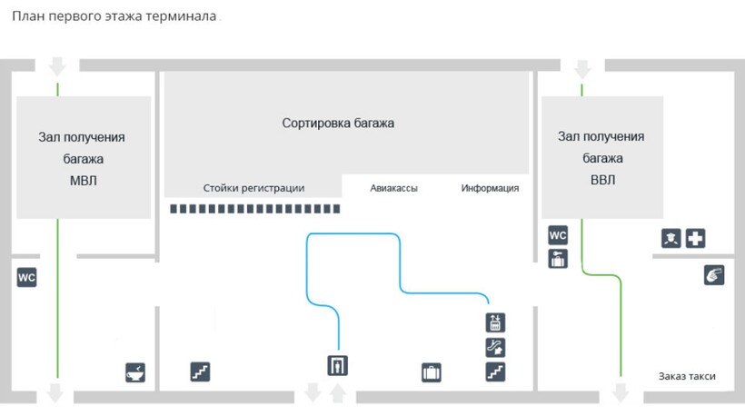 На первом этаже терминала, в левом крыле, вы увидите зону регистрации. Для пассажиров бизнес-класса выделена отдельная стойка. Регистрация пассажиров с инвалидностью проводится без очереди. Специальных терминалов для самостоятельной регистрации в аэропорту не установлено.