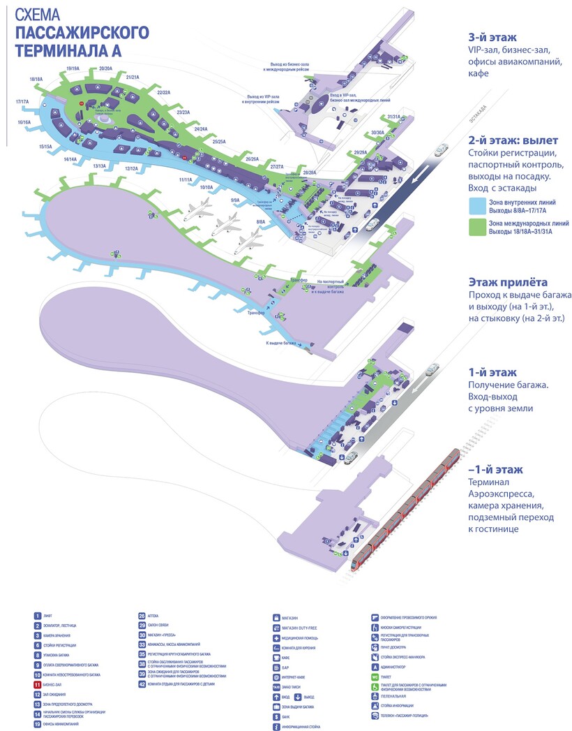 Терминал А имеет множество указателей на русском, английском языке.