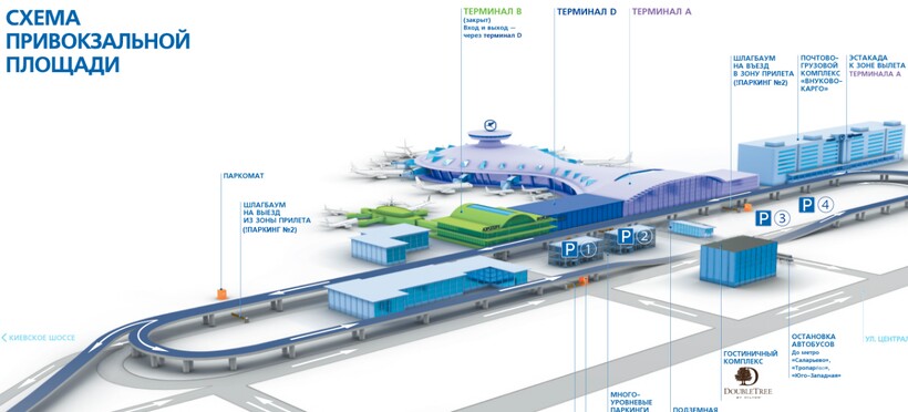 Вы можете перейти из терминала А в терминал В по улице. Терминал D расположен между терминалами А и B. Попасть в терминал D можно только через терминал В. Терминалы B и D соединены между собой переходом. Также есть отдельный терминал для VIP-пассажиров.