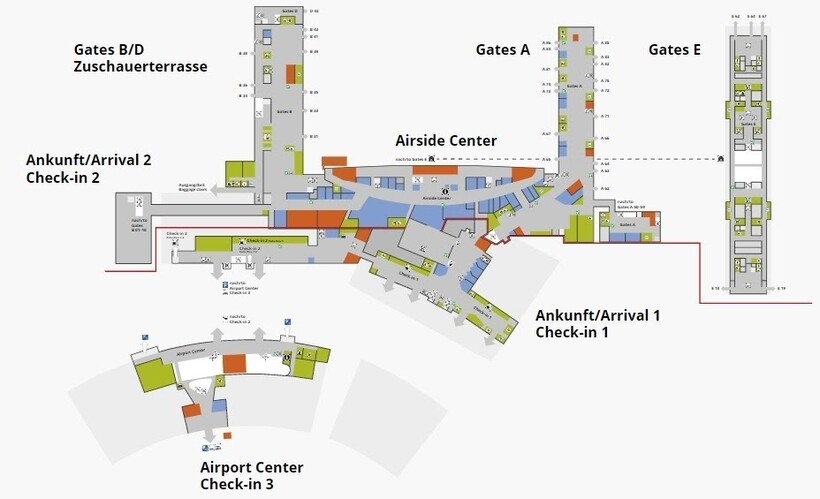 Терминалы A и B расположены на одной территории и имеют общую зону ожидания — Airside Center. Терминал E — отдельно стоящее здание, связанное с двумя другими терминалами Skymetro (поезда отправляются с -2 уровня основного здания аэровокзала примерно каждые 2,5–3 минуты). Отмечу, что на территории авиаузла есть еще здание Airport Shopping или Airport Center. Оно расположено перед терминалами A и B и соединено с ними крытыми переходами.