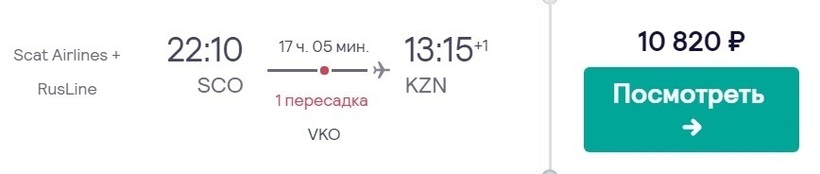 Эта цена актуальна, если купить билеты за 2,5 месяца до вылета. Обратное авиапутешествие со Scat Airlines и «РусЛайн» обойдется примерно в такую же сумму. Общая продолжительность пути — 17 часов. Стыковка в Москве продолжительностью 10,5 ч. будет ночью. Это существенный минус данного варианта, потому что, прилетев в столицу в это время суток, на экскурсию не съездишь, ночевать в аэропорту — удовольствие сомнительное, а номер в гостинице — дополнительные траты.