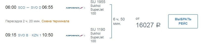 Более быстрый вариант — полет с главной российской авиакомпанией «Аэрофлот». Дорога займет всего 7 часов. Время стыковки — 2,5 часа. Проходит она в Москве (аэропорт Шереметьево). Потребуется смена терминала. Удобно, что полетите по единому билету — не нужно повторно проходить регистрацию на рейс или забирать багаж. Стоимость билетов в одну сторону выше, чем у а/к Scat Airlines и «РусЛайн», — от 16000 рублей (за три месяца).