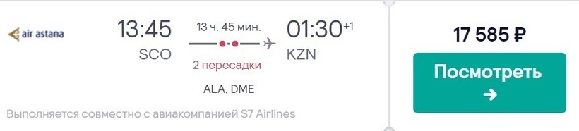 Если на нужную дату нет рейсов с одной пересадкой, или остались только дорогие билеты, можете рассмотреть перелеты с двумя стыковками. Один из самых оптимальных перелетов предлагают «Эйр Астана» и S7. Дорога до конечного пункта займет 13,5 ч. Из этого времени на стыковки в Алматы и Москве уйдет почти 5 часов. Стоимость билетов — от 17500 рублей (цена актуальна за 2 месяца до вылета).