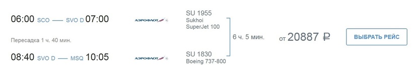 Альтернативой прямому рейсу может служить перелет с пересадками от авиакомпании Аэрофлот - Российские авиалинии. Минимальная стоимость билета составляет 21 259 рублей.