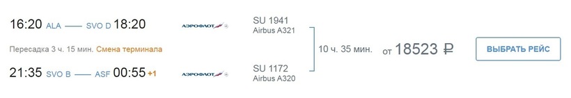 Есть немало транзитных вариантов перелетов в Астрахань из Алматы (прямое авиасообщение отсутствует), расскажу только про самые актуальные варианты. Через Москву до места назначения можно долететь с российской авиакомпанией «Аэрофлот». Продолжительность самого быстро авиаперелета — 10,5 ч. В это время входит и стыковка в Шереметьево (3,5 часа). Цены на билеты стартуют с 18500 рублей (за пару недель до вылета).