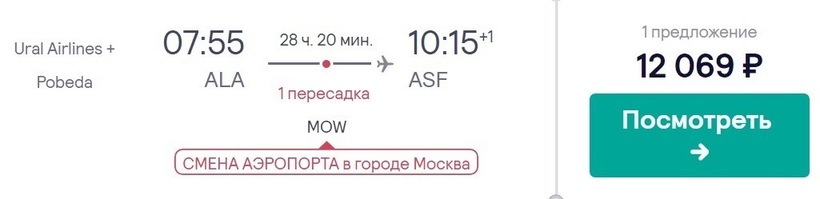 авиаперелет по маршруту Алматы — Москва — Астрахань;