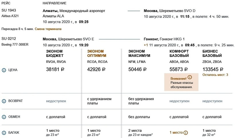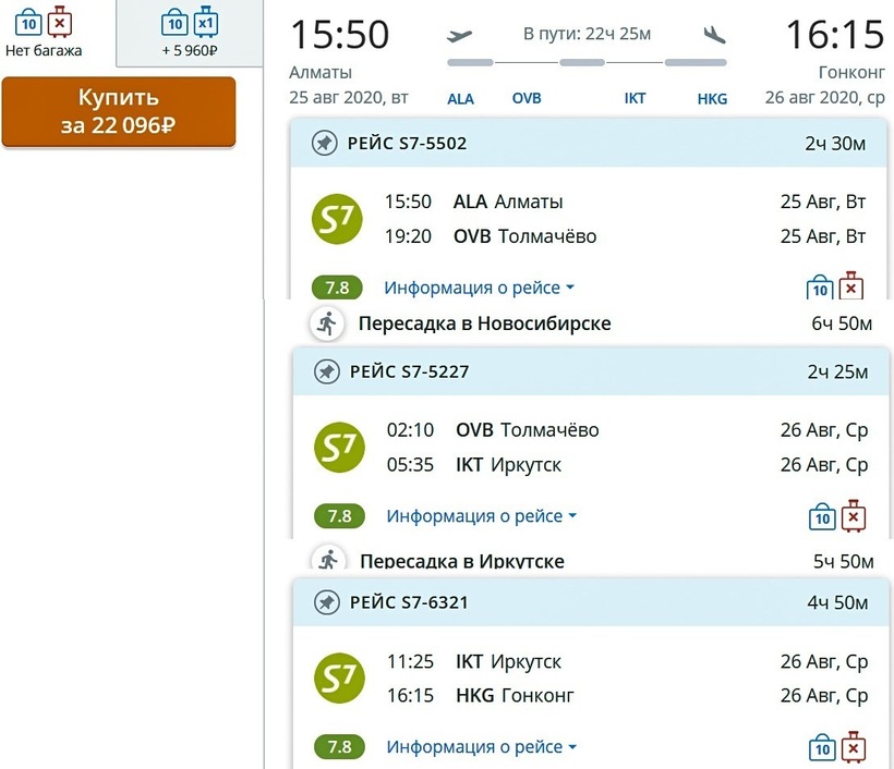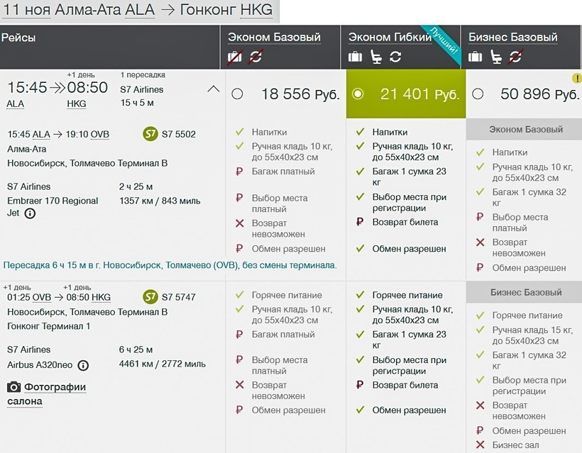 Лайнеры S7 Airlines летают по направлению только один раз в неделю — по средам. С шестичасовой стыковкой в Новосибирске авиапутешествие займет 15 ч. Главная причина, по которой я рекомендую полет с S7, — дешевые билеты: в одну сторону с багажом можно купить всего за 21500 ₽, если забронировать авиаперелет и на обратную дорогу, это будет стоить от 41500 ₽. Цена путешествия только с ручной кладью составляет от 18500 ₽ и 35500 ₽ соответственно. Преодолеть весь маршрут с S7 в бизнес-классе нельзя, потому что полет в данном классе оператор предлагает из Новосибирска в Гонконг, а для первого отрезка пути доступен только класс эконом. Такой вариант авиаперелета обойдется от 51000 ₽.