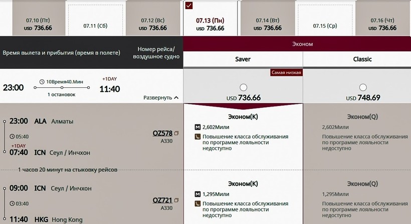 Asiana Airlines уступает российской компании в расписании авиарейсов — азиатский перевозчик осуществляет перелеты с апреля по конец октября во все дни недели, за исключением среды и субботы, в осенне-зимнее время самолеты летают только по вторникам, пятницам и воскресеньям. Зато у Asiana Airlines есть преимущество по продолжительности полета — с полуторачасовой пересадкой в Сеуле путешествие занимает всего 11 ч. Билеты у данного оператора довольно дорогие: на ближайшие даты только туда с багажом стоят от 53500 ₽ (737 $), в обе стороны — от 76500 ₽ (1070 $). Бизнес-класс — от 104000 ₽ (1450 $).