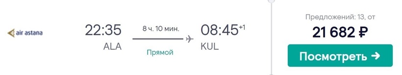 Два раза в неделю до столицы Малайзии из международного аэропорта Алматы летает лайнер самой крупной авиакомпании Казахстана «Эйр Астана». В небе нужно провести восемь часов. Цена на билет только туда — от 21700 рублей (за несколько недель). Накануне вылета эта цифра может быть выше в три раза, так что старайтесь покупать билеты хотя бы за две недели до вылета, ну а лучше за пару месяцев.