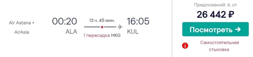 Так как прямые рейсы не ежедневные — этот вариант востребованный. Но рассматривать его как более экономичный — не стоит. Проездные стоят либо также, либо на 10–50% дороже. За четырнадцать часов до конечного пункта можно добраться с «Эйр Астана» и AirAsia (малазийский лоукостер). Билеты за месяц можно купить за 26400 рублей. Это примерно на 20% дороже, чем прямым самолетом.