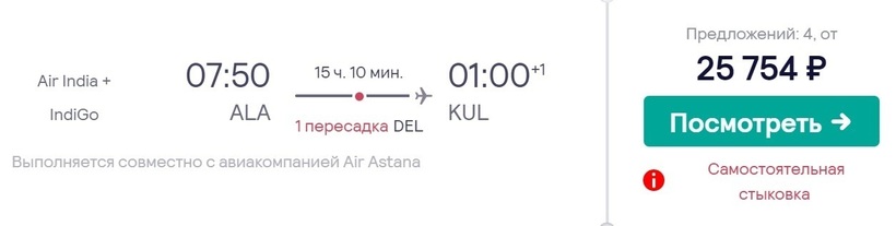 Стыковка — 3,5 часа в Гонконге. Она будет самостоятельной (нужно забрать багаж, пройти регистрацию на следующий рейс). Через Дели до Куала-Лумпур можно долететь за пятнадцать часов. Перевозчики: Air India (совместно с «Эйр Астана») и IndiGo. Билеты — 25700 рублей (за пару недель).