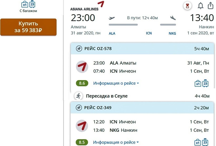 Я летала в Нанкин в ноябре с Asiana Airlines. Хотя в этот период года авиарейсы выполняют и «Китайские Южные авиалинии», я предпочла южнокорейского оператора потому, что время в пути с ним тратится на 4 часа меньше, и билеты стоили на 12500 ₽ дешевле (в одну сторону). Любителям бизнес-класса лучше выбрать полет с авиакомпанией China Southern Airlines, у которой цена путешествия в данном классе ниже на 40000 ₽, чем у «Азиатских авиалиний».