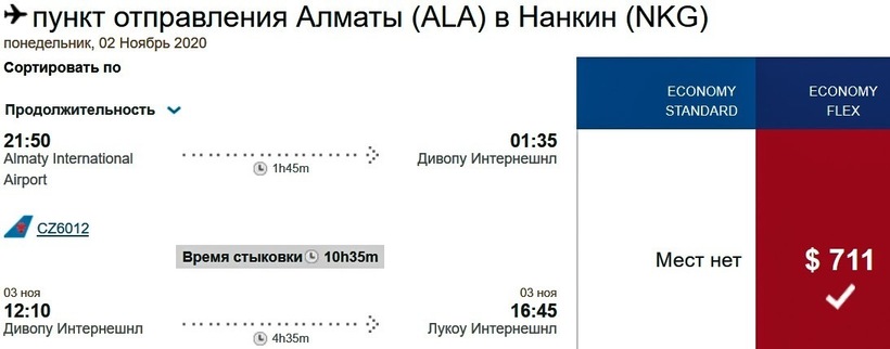 Рейсы Алматы — Нанкин осуществляет только одна авиакомпания - Китайские Южные авиалинии. Минимальная стоимость билета составит 20 835 рублей.